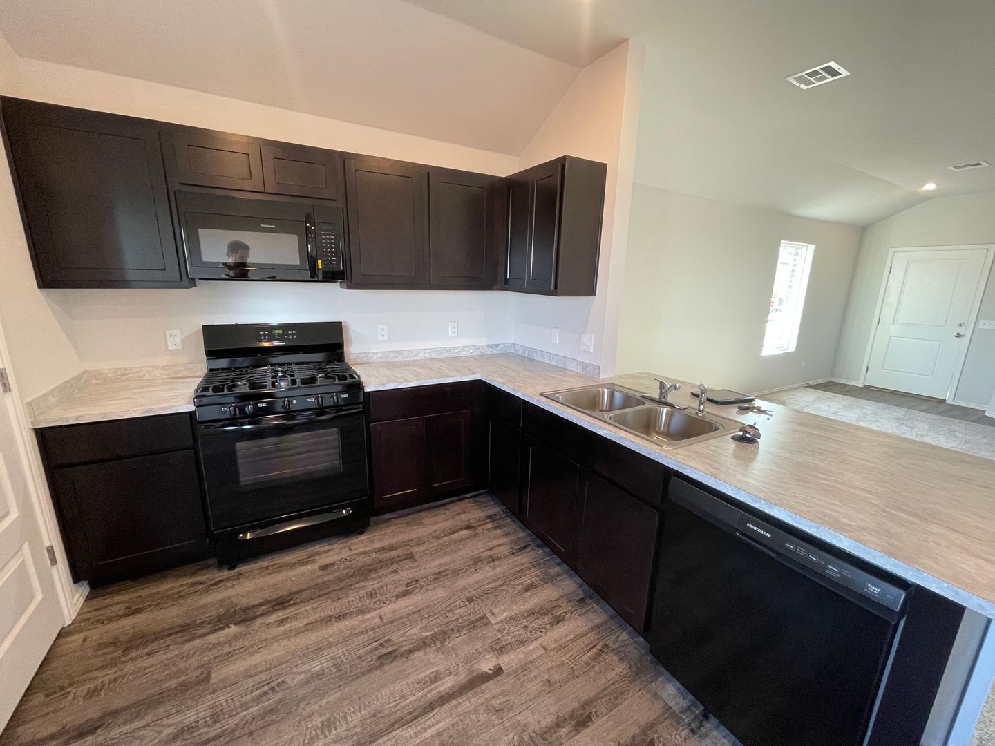 Gas range, dishwasher and microwave included.