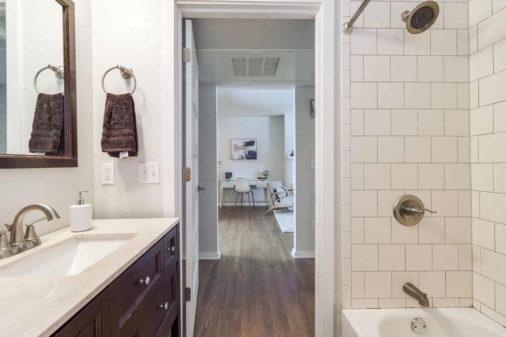 Welcome to this charmingly updated 1 Bedroom 1 Bathroom Bungalow Located in the Historic Jefferson Park District of Oklahoma City, OK. This delightful bungalow boasts one spacious bedroom and a full bathroom, featuring a tiled shower/tub combo. The home is adorned with original hardwood flooring, adding a touch of vintage elegance to the modern updates. The kitchen is equipped with stone countertops and includes all necessary appliances, making meal preparation a breeze. Ceiling fans throughout ensure a comfortable atmosphere in every season. Step outside to your covered balcony, the perfect spot for morning coffee or evening relaxation. A parking area/spot is included on the north side of the building for your convenience. One of the best features of this home is its location. Dining and entertainment are within walking distance of artsy Paseo neighborhood. Near I-235 and just a few miles north of downtown nightlife in Bricktown OKC. Experience the perfect blend of historic charm and modern convenience in this beautiful Oklahoma City home on NW 23rd St.