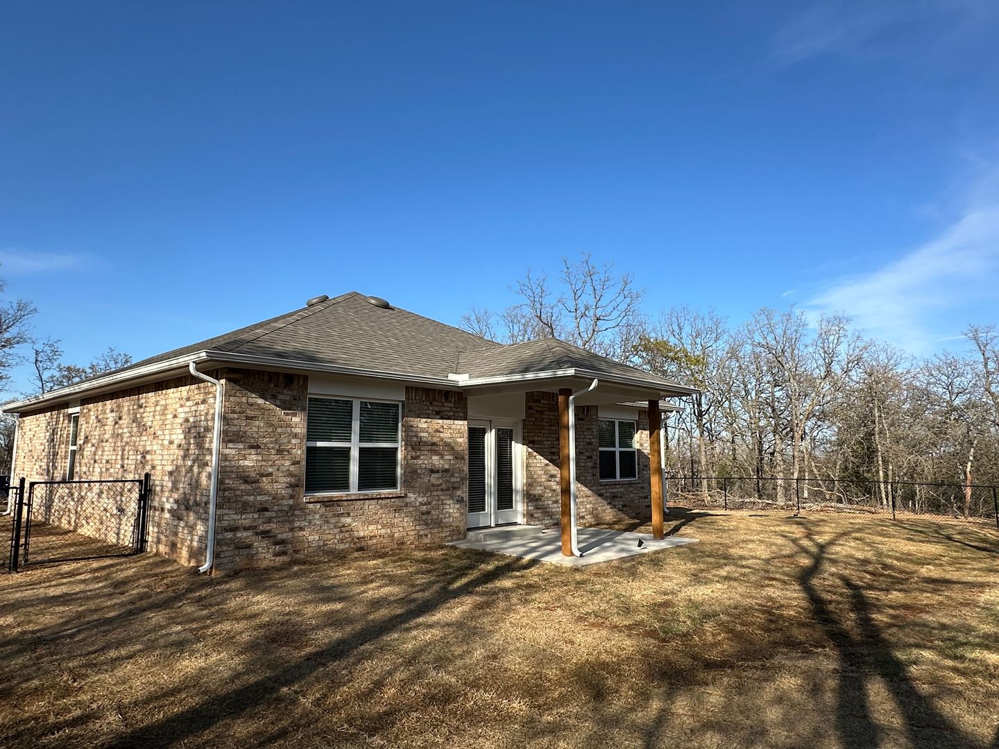 The open-concept layout features stylish wood-look tile flooring throughout main living areas, creating a warm and inviting atmosphere. The kitchen boasts white cabinets, stainless steel appliances, pantry and a tiled backsplash. The primary suite is complete with a walk-in closet, a double sink vanity and a tiled shower stall. Two additional bedrooms feature carpet and ceiling fans. Enjoy relaxing evenings on the open back patio overlooking the wooded lot. Other features include sprinkler system, interior laundry room, fenced in backyard and 2-car garage. The community includes clubhouse, pool, playground, basketball court, covered pavilions and walking trails. Lawn Care Included, sodded front, side and with in the fenced backyard only. Pets are case by case.